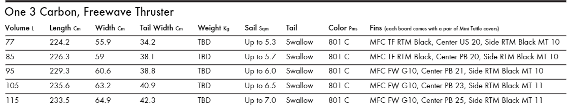 Większe rozmiary (105l i 115l) zostały zaprojektowane z myślą o cięższych riderach oraz słabych wiatrach.