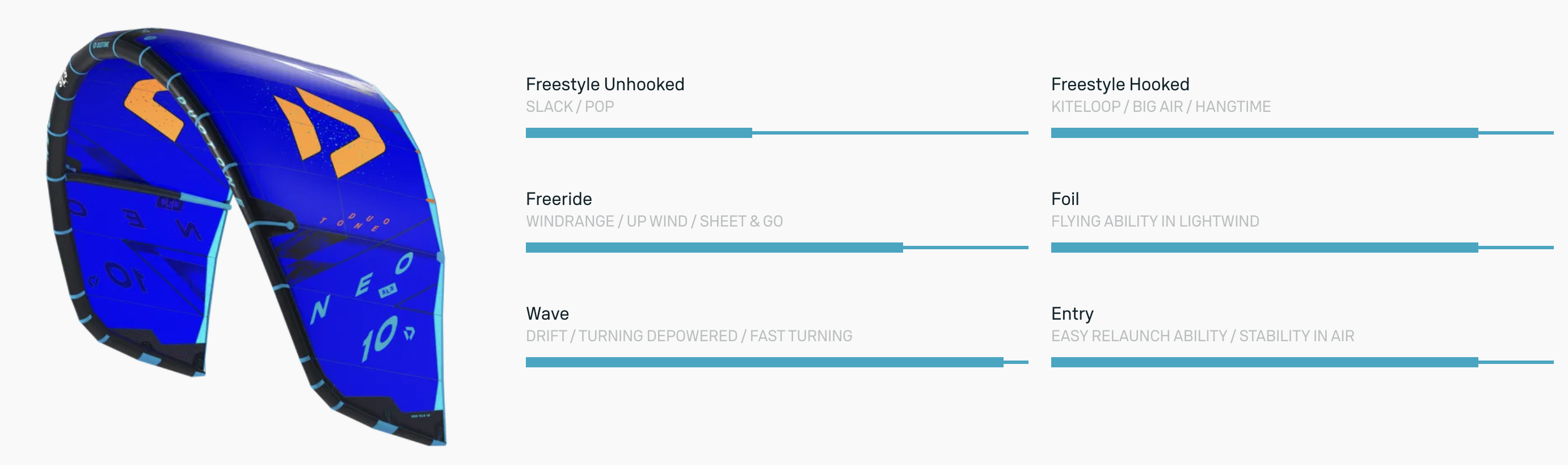 Neo SLS słynie z wybitnej zdolności do dryfu, co pozwala utrzymać kite w powietrzu nawet przy maksymalnym odpadaniu. W połączeniu z intuicyjnym czuciem na barze, zapewnia pełne skupienie na fali i stylu jazdy – a nie na kite’cie.