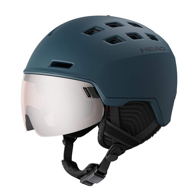Visor construction to konstrukcja HEAD z wbudowaną, chroniącą przed wiatrem szybą z ochroną UV, która pozwala narciarzom na jazdę w okularach. Zaciągnięcie szyby doskonale chroni oczy podczas jazdy.